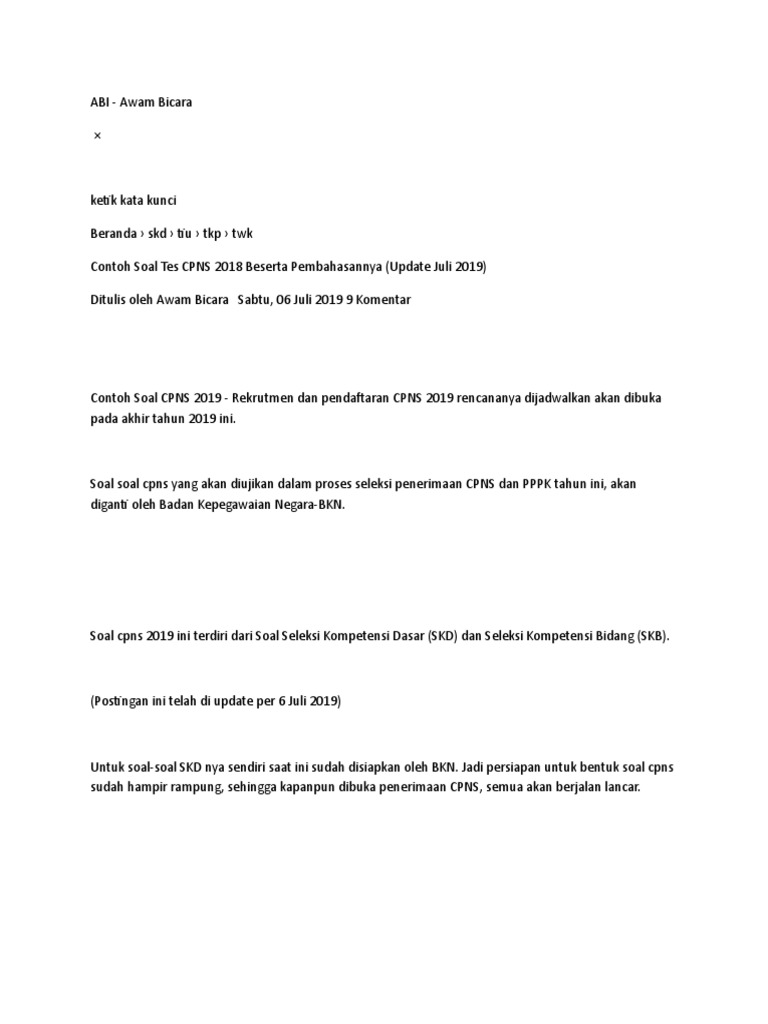 100 contoh soal skd cpns dan pembahasanannya i. Download contoh soal cpns 2020 beserta jawabannya. Soal twk cpns 2019 pdf dan kunci jawaban lengkap serta pembahasannya sebagai referensi belajar sebelum mengikuti tesnya nanti kunjungi www.catbkn.com. Demikian, berbagi pengetahuan bersama kak ajaz. Nah jadi selain harus berlatih menjawab contoh soal cpns tkp dan jawabannya 2019, anda juga harus mempelajari contoh.